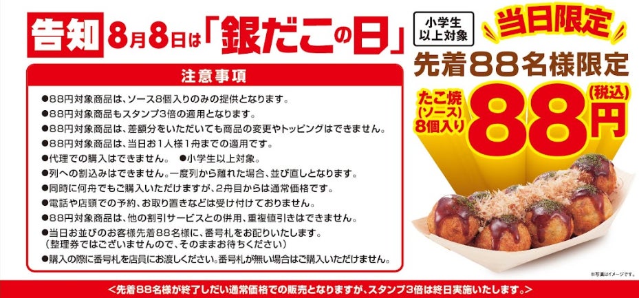 今年の 「銀だこの日」 特別イベントは、昨年に引き続き 「各店先着88名様※1に、 “ぜったいうまい!! たこ焼” (ソース・8個入り) を1舟 88円(税込)」 で提供してくれます。