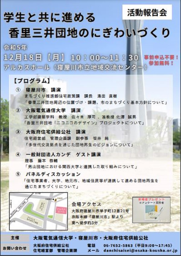 寝屋川市(市⻑:広瀬 慶輔)と大阪電気通信大学(寝屋川市、学⻑:塩田 邦成、「以下、電通大」)、⼤阪府住宅供給公社(⼤阪府内において公社賃貸住宅SMALIO(スマリオ)を提供)は、共催で、学生を主体とした団地のコミュニティ活性化やまちづくりに関する活動報告会を2023年12月18日(月)に開催します。