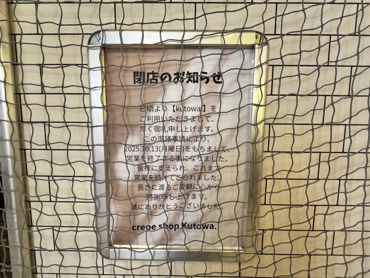 こちらのお知らせによりますと、「閉店のお知らせ 日頃より【kutowa.】をご利用いただきまして、厚く御礼申し上げます。この度諸事情により、2025.10.13(月曜日)をもちまして、営業を終了する事になりました。皆様に支えられ、これまで営業を続けてこられました。長きに渡るご愛顧に心から感謝申し上げます。誠にありがとうございました。 crepe shop kutowa.」とのことです。