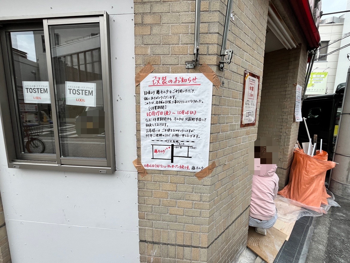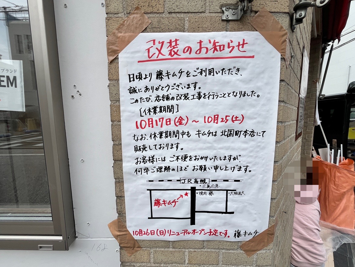 こちらのお知らせによると、「改装のお知らせ 日頃より藤キムチをご利用いただき、誠にありがとうございます。このたび、店舗の改装工事を行うこととなりました。【休業期間】10月17日(金)〜10月25日(土)。なお、休業期間中もキムチは北園町本店にて販売しております。お客様にはご不便をおかけいたしますが、何卒ご理解のほどお願い申し上げます。10月26日(日)リニューアルオープン予定です。 藤キムチ」