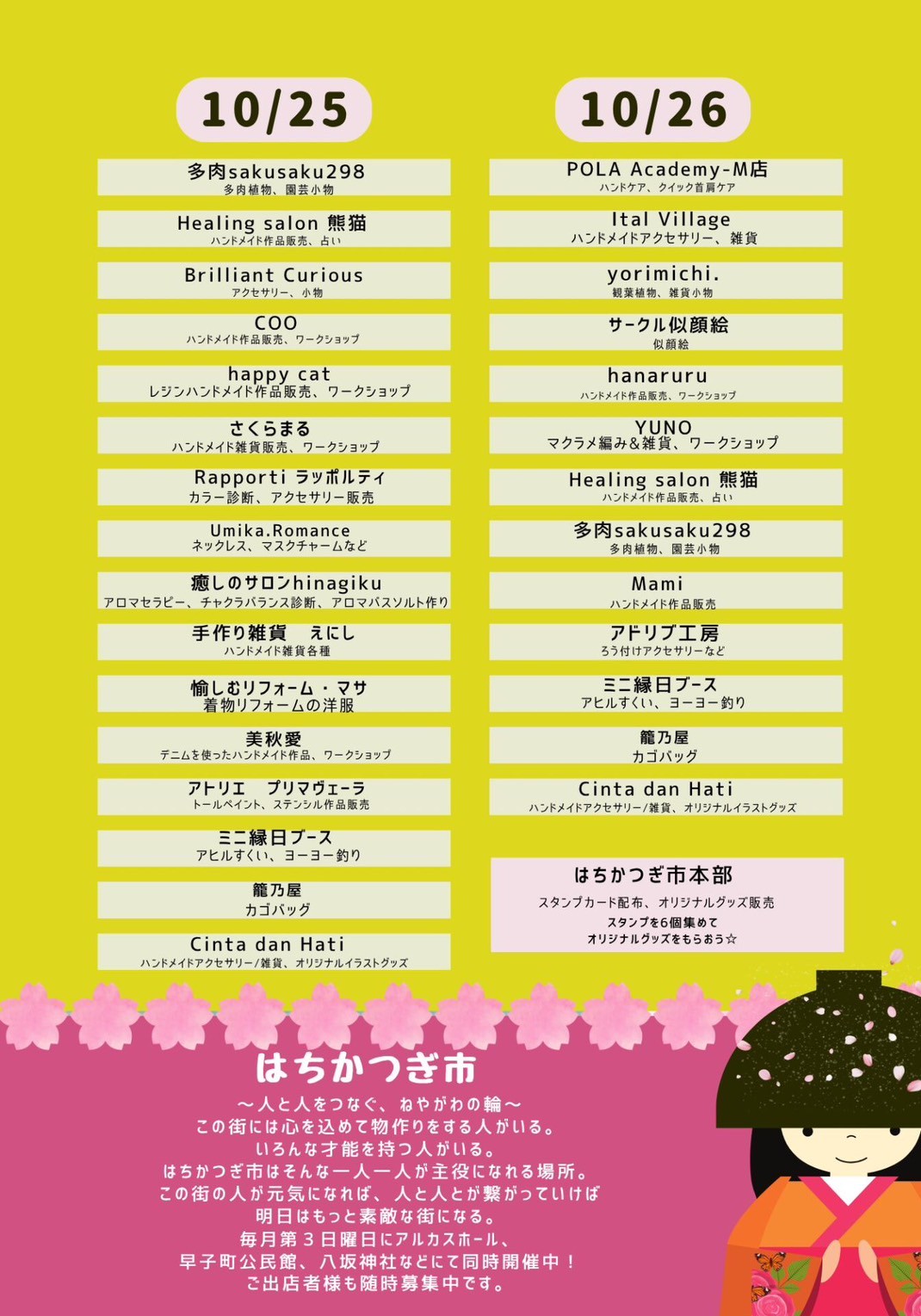 「はちかつぎ市」では、ハンドメイド・雑貨・植物・リラクゼーション・占いなど、多彩なブースが並びます。