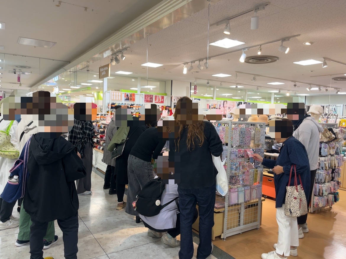 下の写真は、オープン初日である2025年10月24日(金)の開店直後の様子です。多くの人で賑わっていました。シールやカバンなどといった雑貨が多数取り揃えられていました。