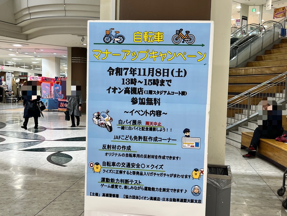 こちらのお知らせによりますと、「自転車マナーアップキャンペーン 令和7年11月8日(土)13時〜15時まで イオン高槻店(1階スタジアムコート横)参加無料」とのことです。イベント内容は、白バイ展示(雨天中止)・JAFこども免許証作成コーナー・反射材の作成・自転車の交通安全○×クイズ・運動能力判断テスト、などあります。主催は高槻警察署です。