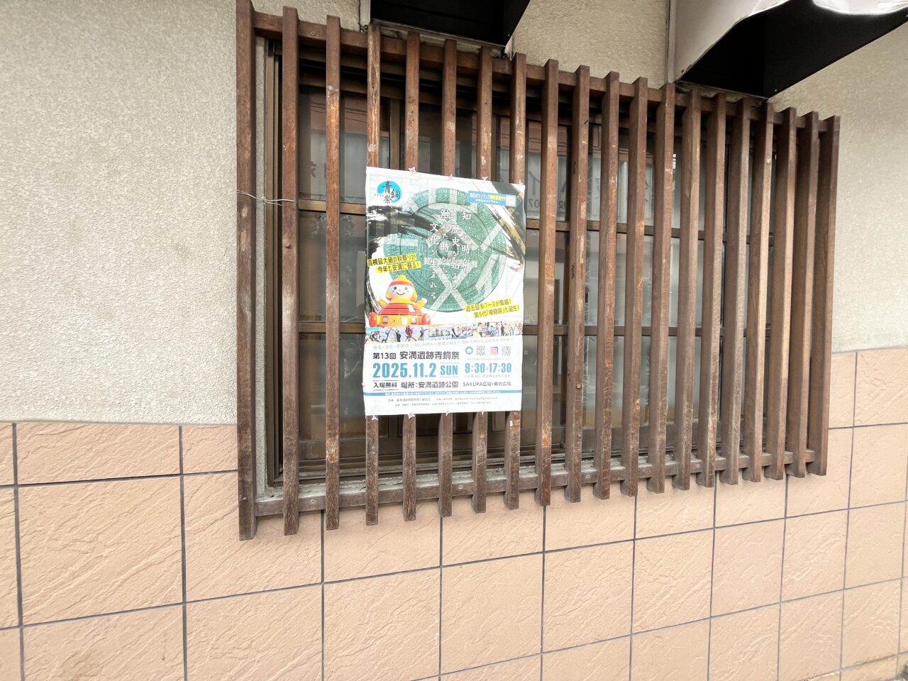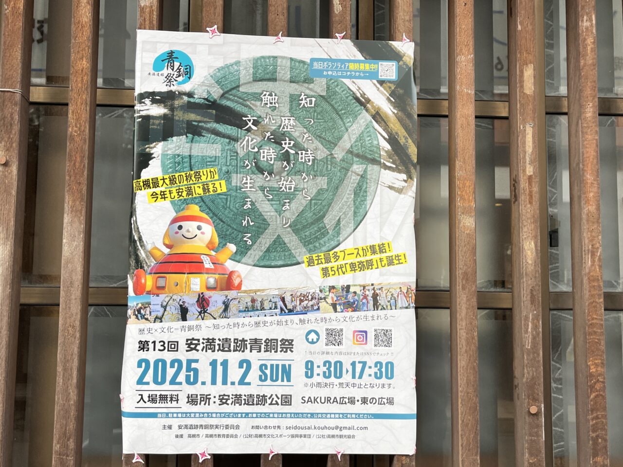 青銅祭の公式Instagramによると、メインステージ「高槻ウェーブ歴史舞台」や「安満のこども村」もバージョンUPしているそうです。またこちらの記事でも紹介した、「卑弥呼コンテスト」は、過去最多エントリー数を記録とのこと。出店ブース数は約42店舗だそうです。下の写真は、北園町に掲示されていたお知らせです。