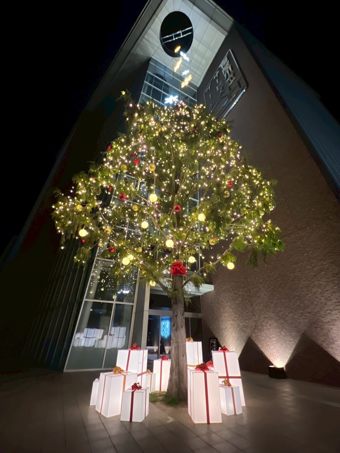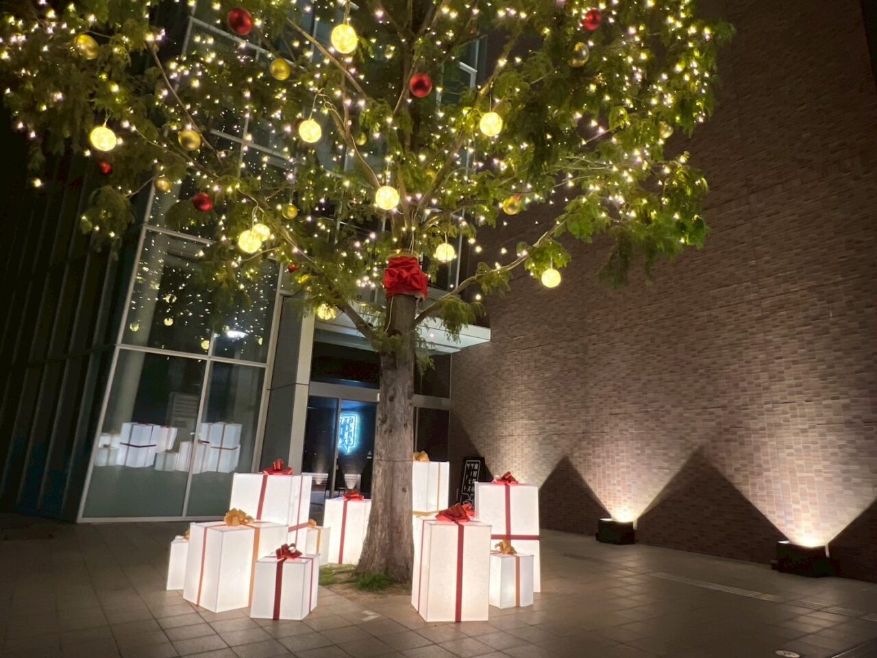 ツリーの足元には、プレゼントの箱が点灯し、温かな空間となっています。