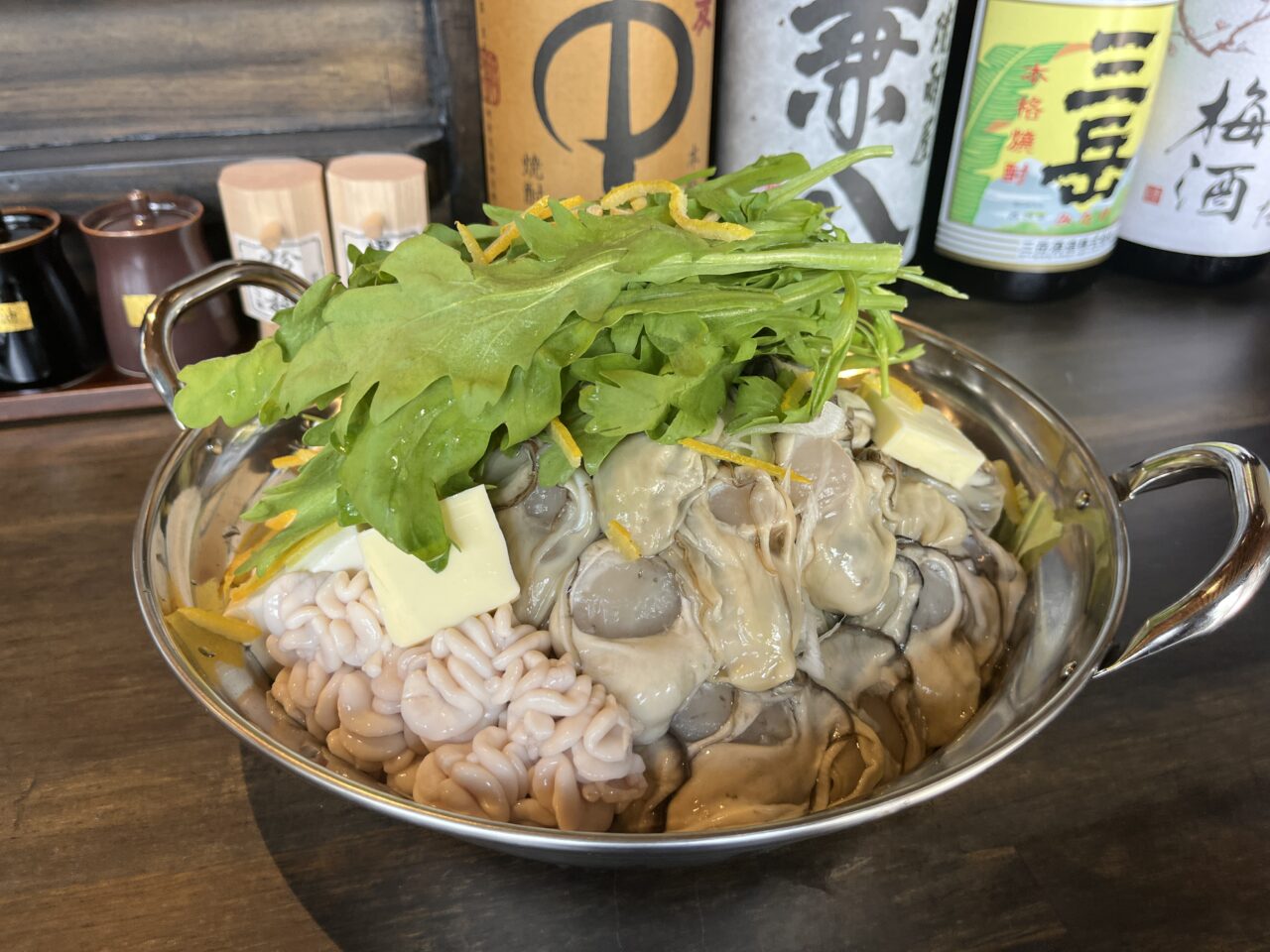 こちらは、ディナーメニューで楽しむことのできる、「牡蠣鍋 白子追加(写真は3人前)」です。寒い季節が始まり、鍋の美味しい季節。ぜひ来店してご賞味くださいね。ちなみに1人前から注文可能とのことですよ♪ 美味しいお酒と一緒にいかがですか?