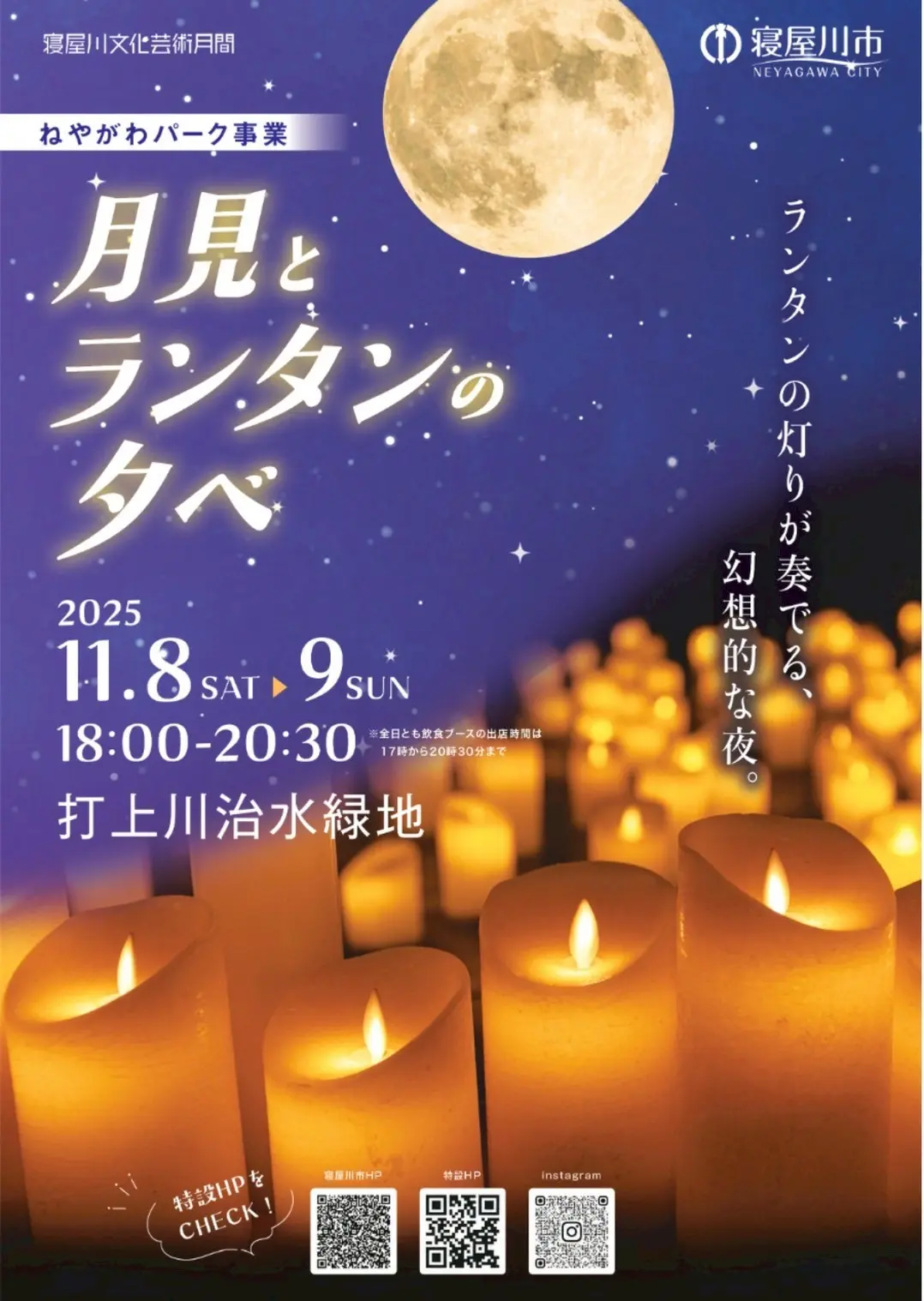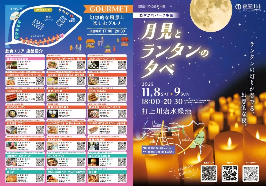 寝屋川市は、令和7年11月8日(土)・9日(日)の2日間、打上川治水緑地で、ねやがわパーク事業『月見とランタンの夕べ 2025』を開催中です。
