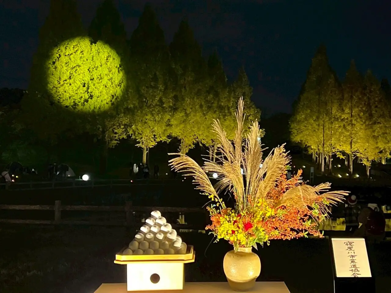 昨夜は雲が多く、本物のお月様は見えなかったのですが、ライトアップされたメタセコイアに、満月が投影され、お月見も楽しめました。