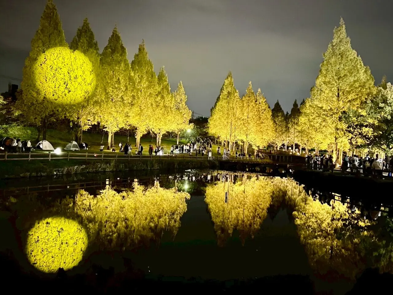 ・ メタセコイアが光の衣装に身を包み、普段とは違う夜の顔に