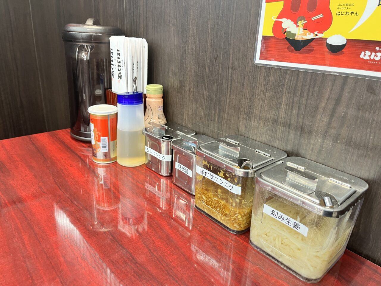 店内には、テーブル席とカウンター席があり、テーブルには、ニンニクや生姜などが置いてありました。