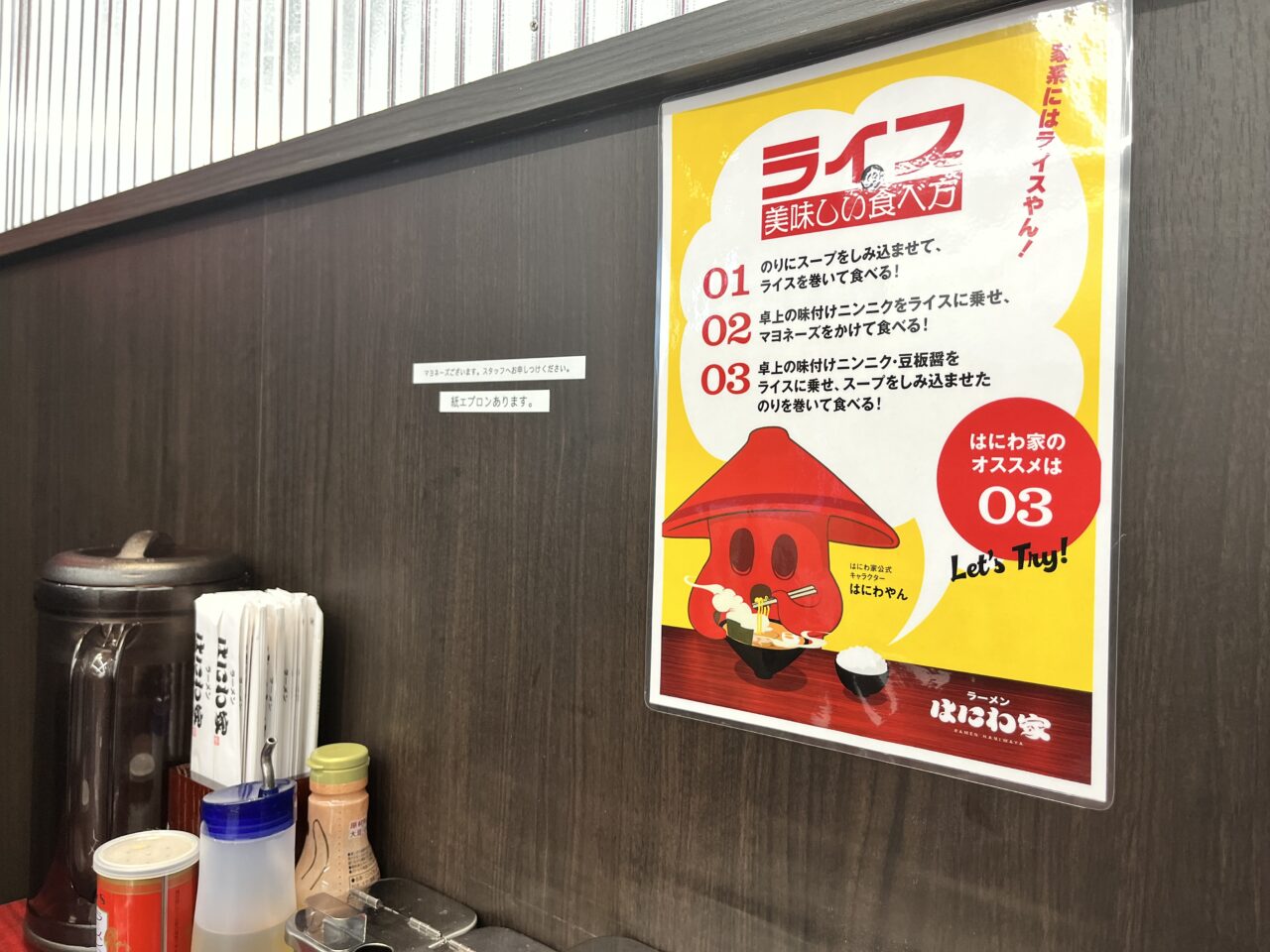 おすすめのご飯の食べ方も紹介されていましたよ。ちなみに、はにわ家おすすめの食べ方は3だそうで、卓上の味付けニンニク・豆板醤をライスに乗せ、スープをしみ込ませた海苔を巻いて食べる! だそうですよ。