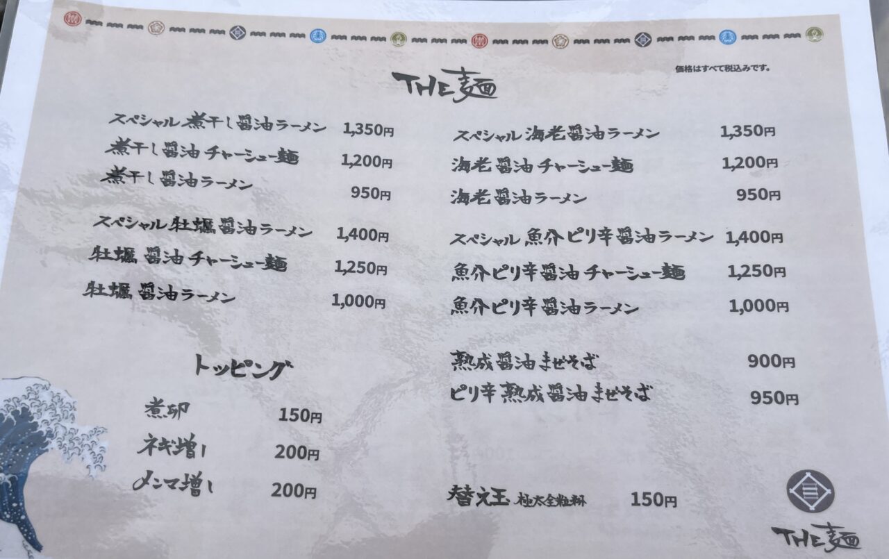 海老・牡蠣・煮干など、旨味と香りを引き出した“醤油だれ”が主役のラーメンを味わうことができる「THE 麺」ブランドは、「人類みな麺類」を運営するUNCHIグループのラーメンブランドの1つです。こちらは「THE 麺」のメニュー表です。煮干し醤油・牡蠣醤油・海老醤油・魚介ピリ辛醤油といった醤油ベースのラーメンを楽しむことができます。トッピングもつけることができます。
