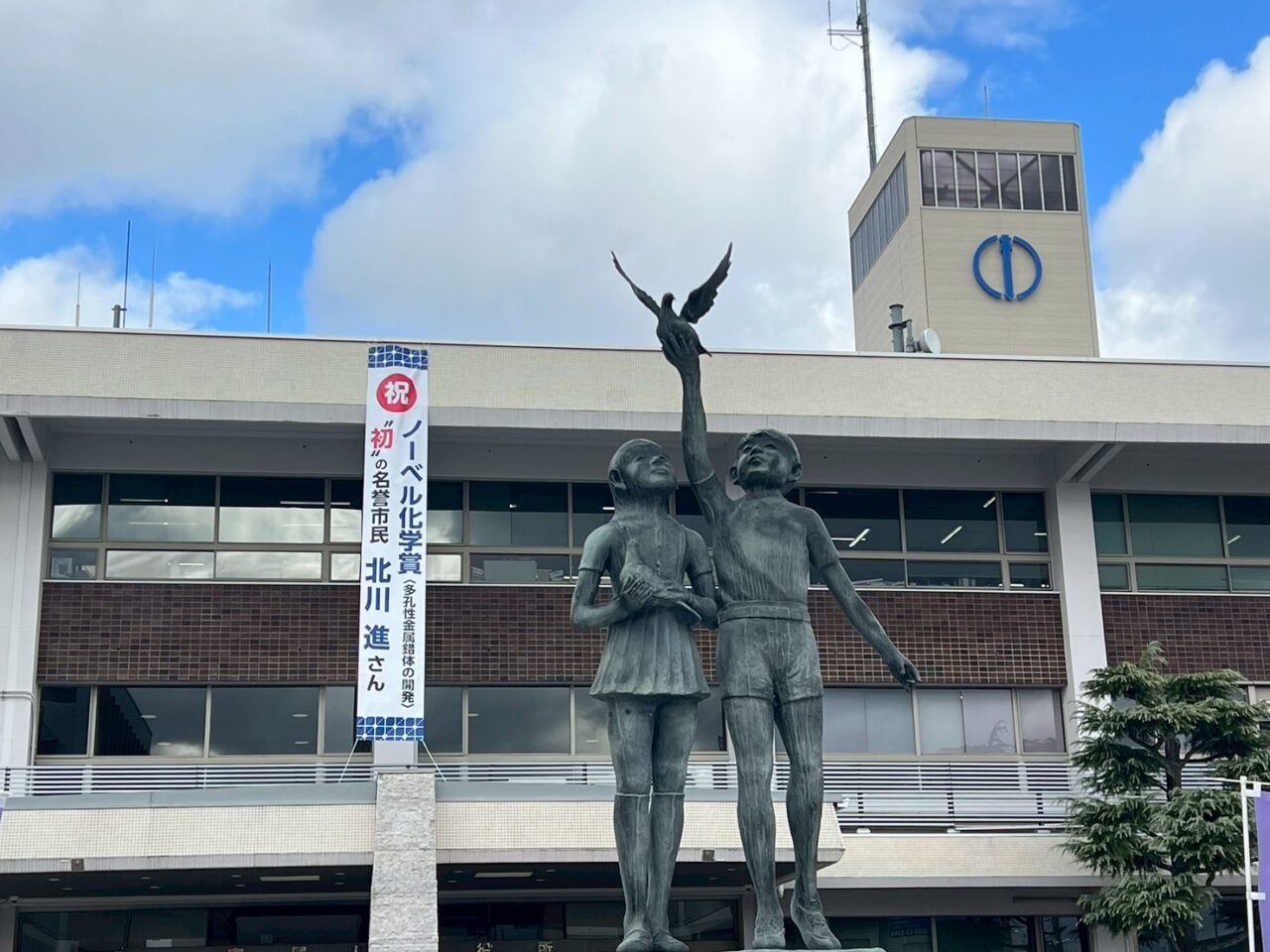 現在、寝屋川市役所には、ノーベル化学賞受賞の北川進さんの懸垂幕が掲げられています。