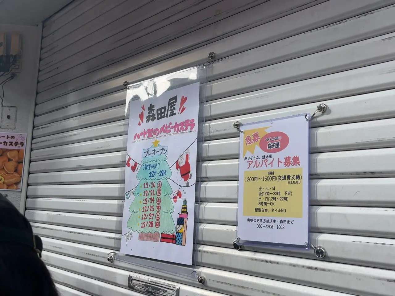 こちらはお店の前に掲示されていたお知らせです。こちらによると、「森田屋 ハート型のベビーカステラ プレオープン期間中は、営業時間は12時〜22時で2025年12月20日(土)21日(日)24日(水)25日(木)27日(土)28日(日)」とのこと。