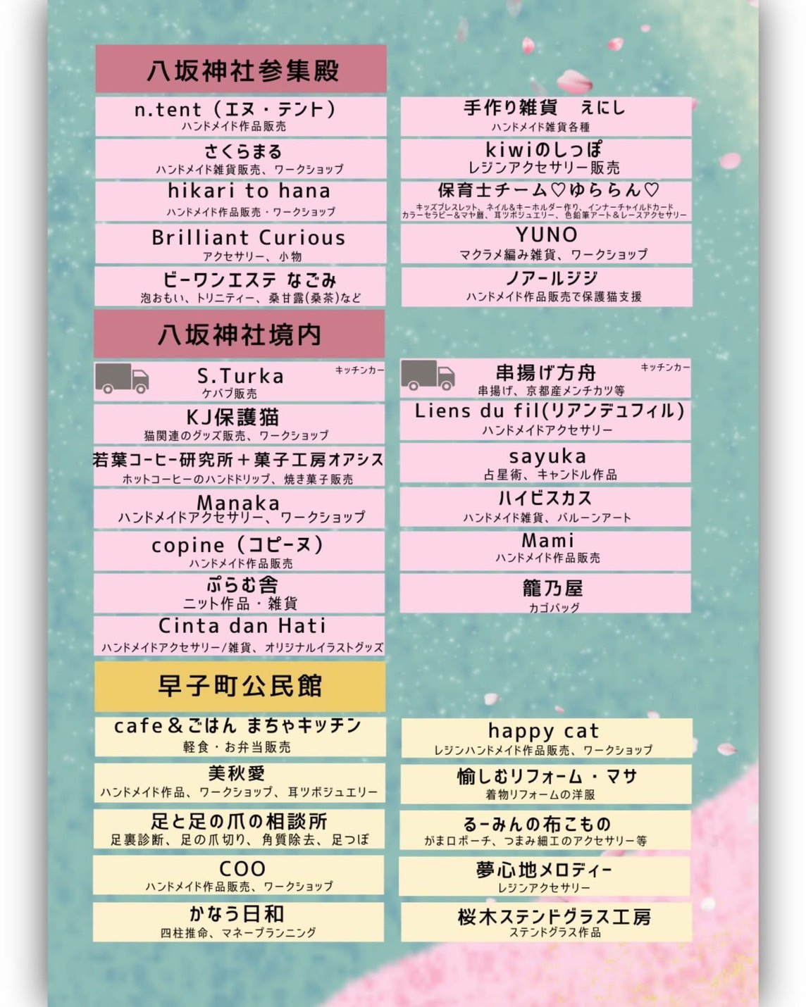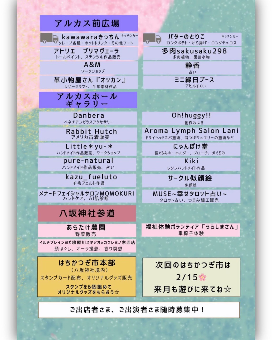 ハンドメイド作品、飲食、ワークショップ、癒しの体験、そして音楽や踊りのステージイベントまで新しい一年のはじまりに、この街で活動する一人ひとりが主役になる一日です。