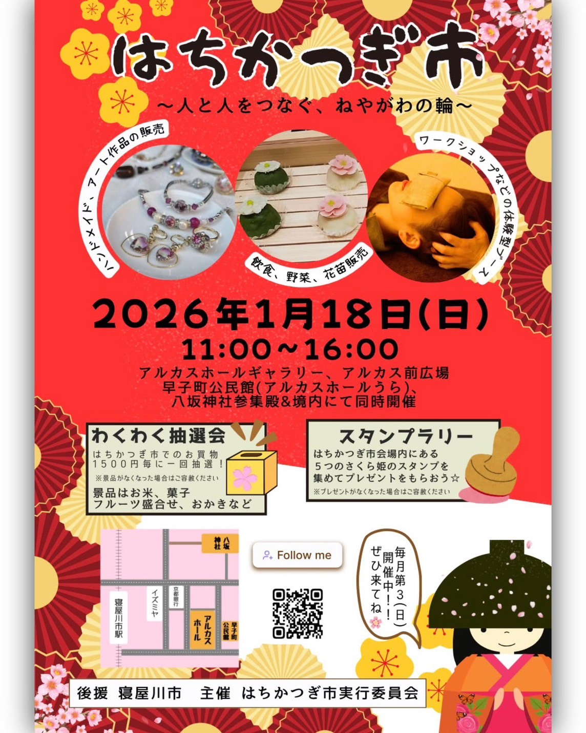 2026年1月18日(日)、「月に一度は寝屋川市で遊ぼうよ! 」を合言葉に地域のハンドメイド作家さんたちや音楽・ダンスなどのアーティストが一堂に会する今年最初のはちかつぎ市が開催されます。