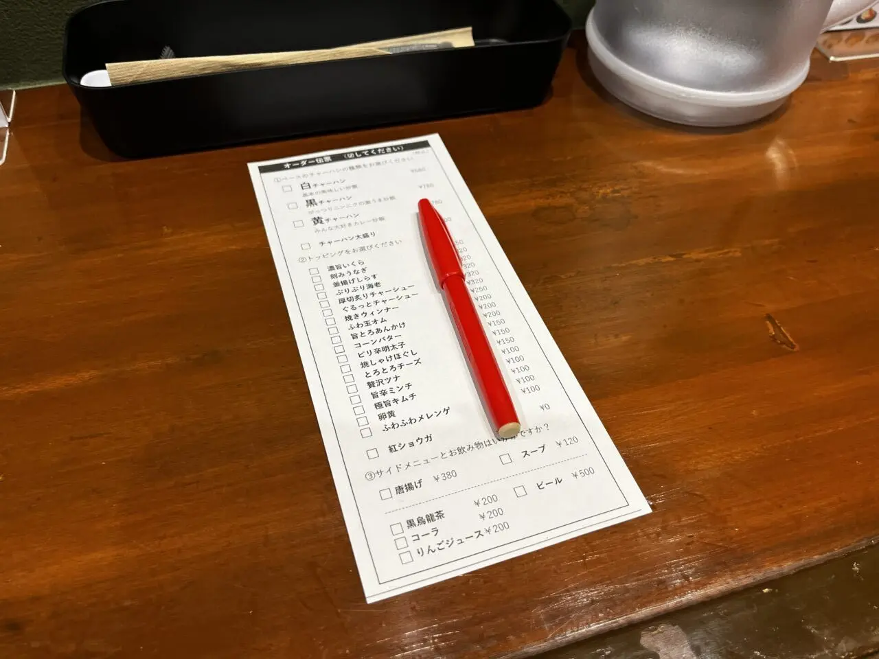 こちらはオーダー伝票です。ベースとなる3種類の白チャーハン(基本のチャーハン)・黒チャーハン(ニンニクチャーハン)・黄チャーハン(カレーチャーハン)から1種類を選んだ上で、いくら・うなぎ・しらすなどといったトッピングからお好みのトッピングを選びます。サイドメニューや飲み物もあります。
