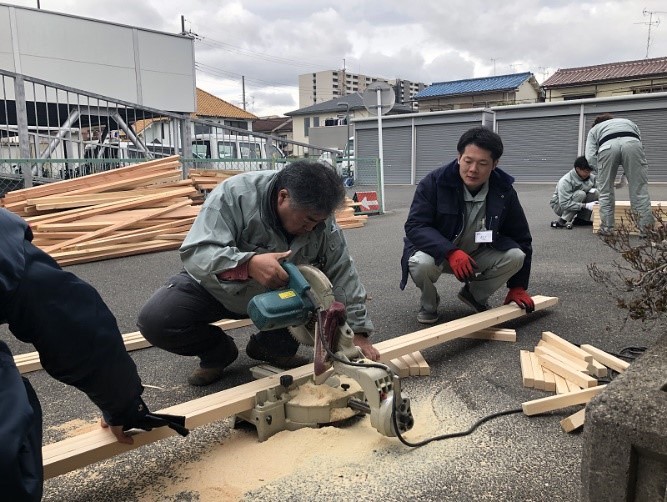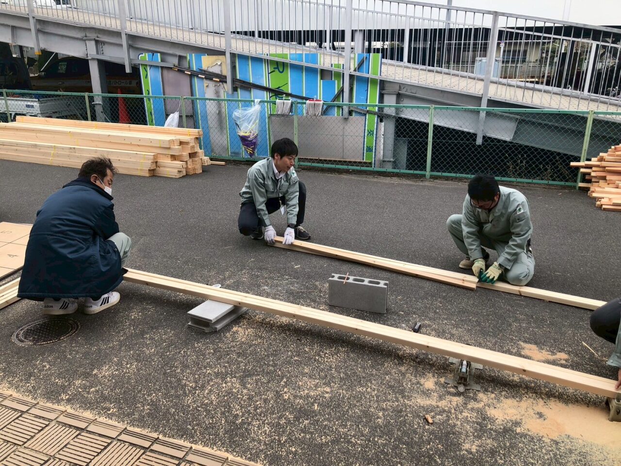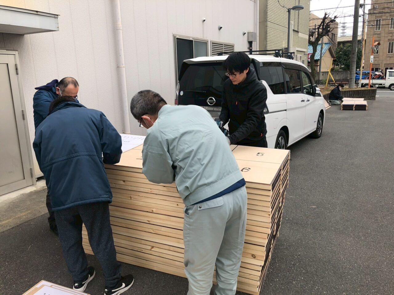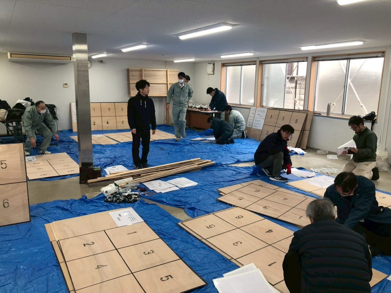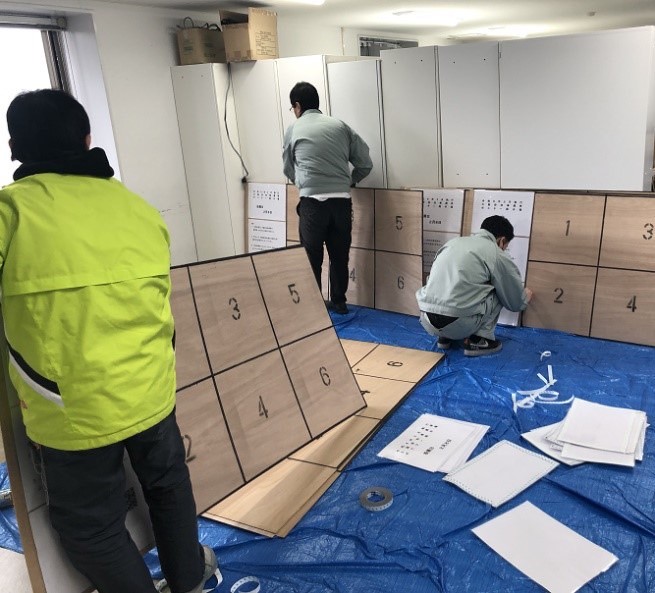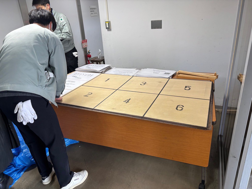 通常時であれば、 ポスター掲示板の作成は、事業者委託で行われますが、2026年2月選挙においては、事業者による印刷では告示日(1月22日)に間に合わないため、知事選分のポスター掲示板は市職員が手作りしました。写真は、職員によるポスター掲示板づくりの様子です。