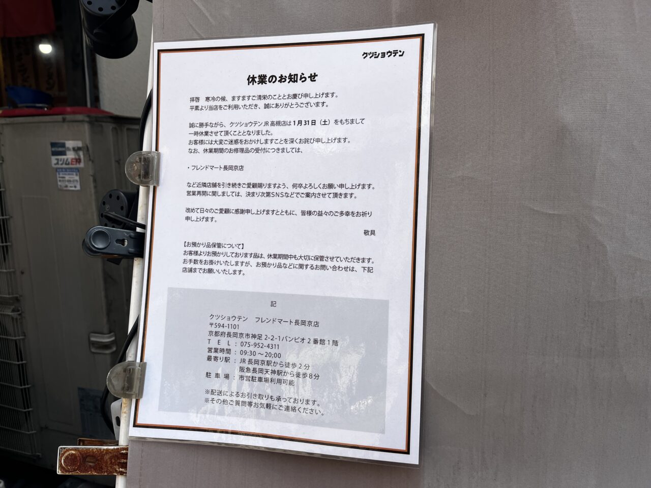 高槻市高槻町にある「クツショウテン JR高槻店」が2026年1月31日をもちまして一時休業となります。