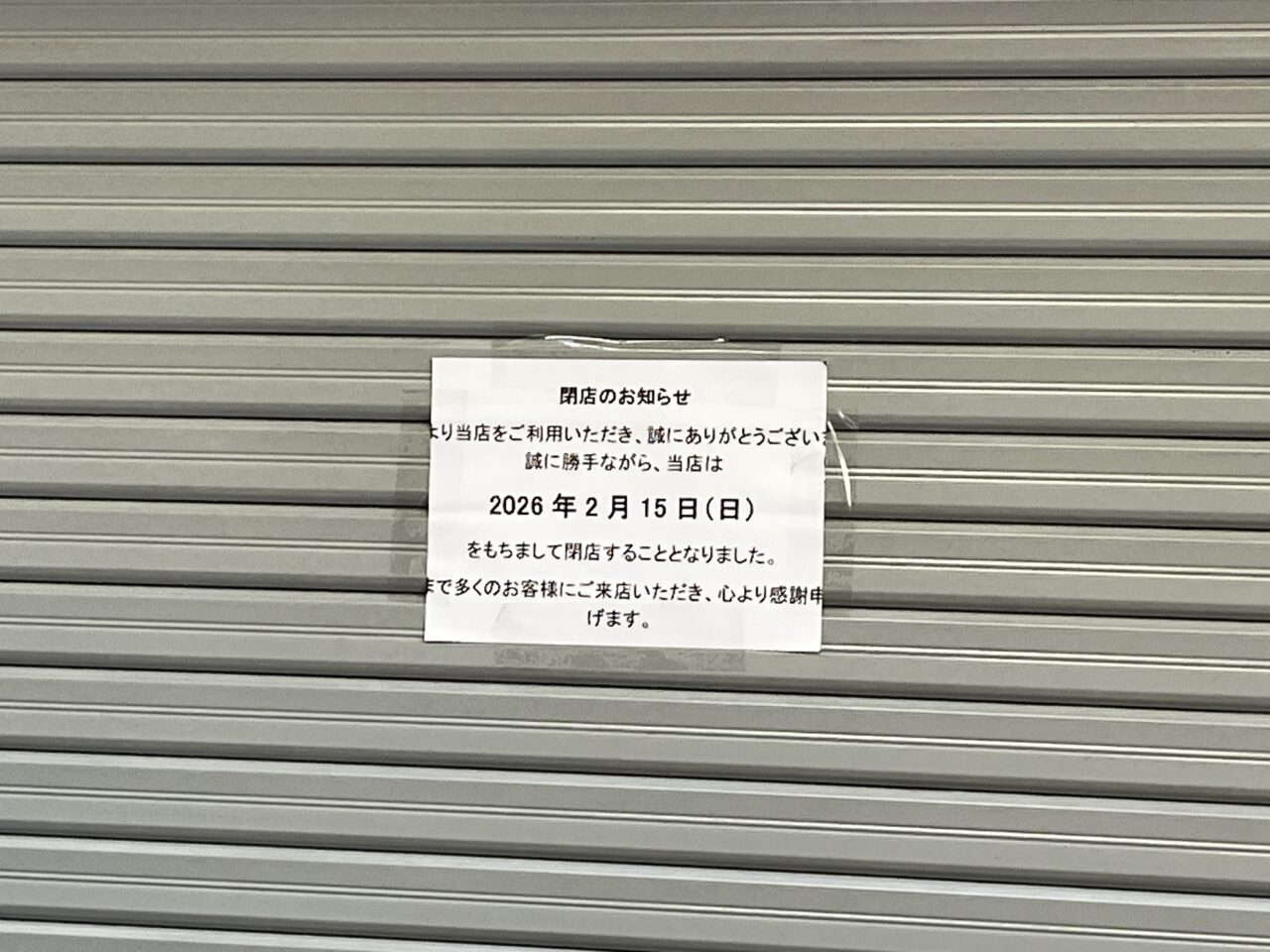 こちらのお知らせによりますと、「閉店のお知らせ 当店をご利用いただき、誠にありがとうございます。誠に勝手ながら、当店は2026年2月15日(日)をもちまして閉店することとなりました。多くのお客様にご来店いただき、心より感謝申し上げます」とのこと。