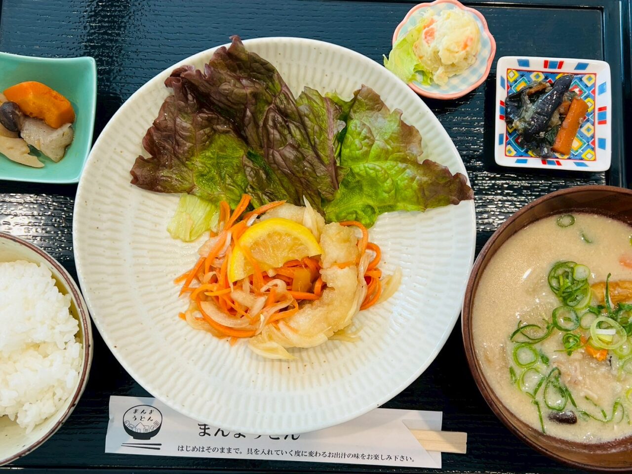 白身魚の南蛮酢をメインにかす汁と小鉢料理がセットとなっており、ヘルシーでありながら食べ応え十分な定食です。