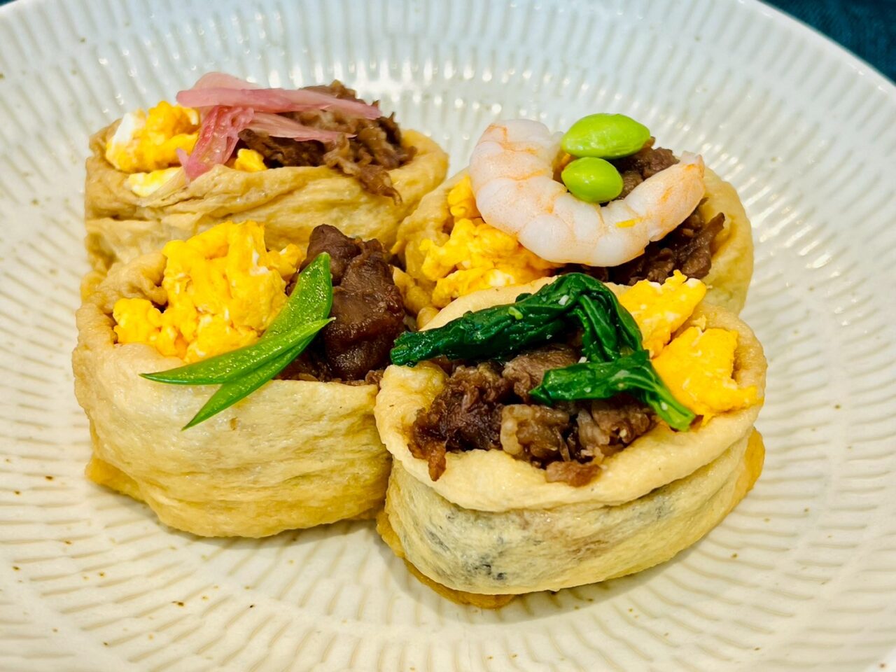 4種類の具材が入ったおいなりさんは、こだわりの出汁で煮込んだお揚げで包まれています。