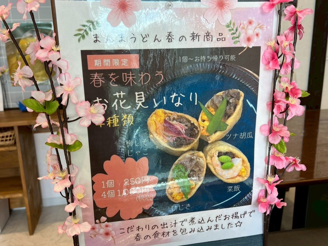 【寝屋川市】太秦緑が丘の「まんまうどん」の春の新メニュー! おいなりさんと「まんまドーナツ」でお花見に出かけませんか?