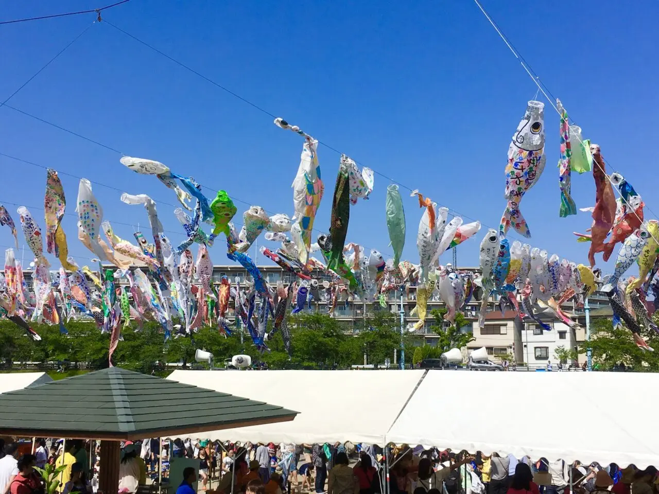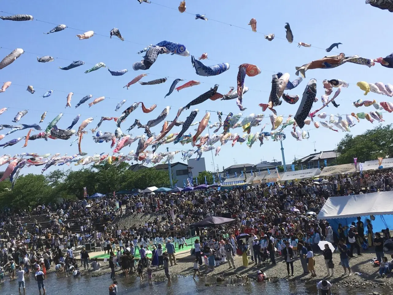 公式HPによると、「こいのぼりフェスタ1000」は、一般社団法人高槻青年会議所の創立25周年の記念事業として、河川愛護ならびに高槻市民のふるさと意識高揚を目的として、平成4年(1992年)に開始されました。市民のニーズに応えイベントへと発展したそうです。下の写真は2018年4月29日の様子です。