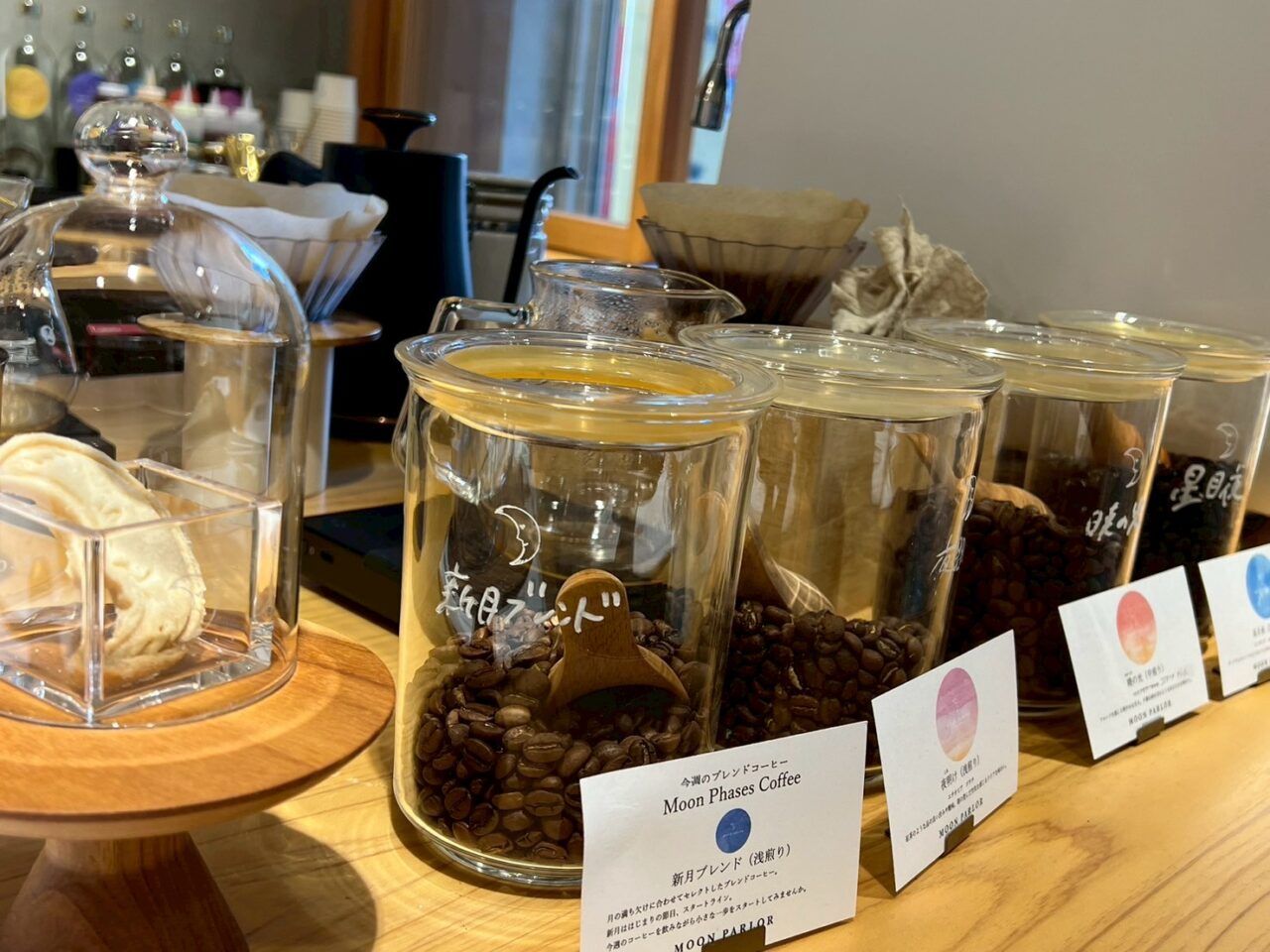 新月から満月にかけ週毎に異なる月のブレンドの他、シングルコーヒーやカフェラテ、キャラメルラテ、また自家製柚子茶、ソフトドリンクなどこだわりのドリンクが提供されています。