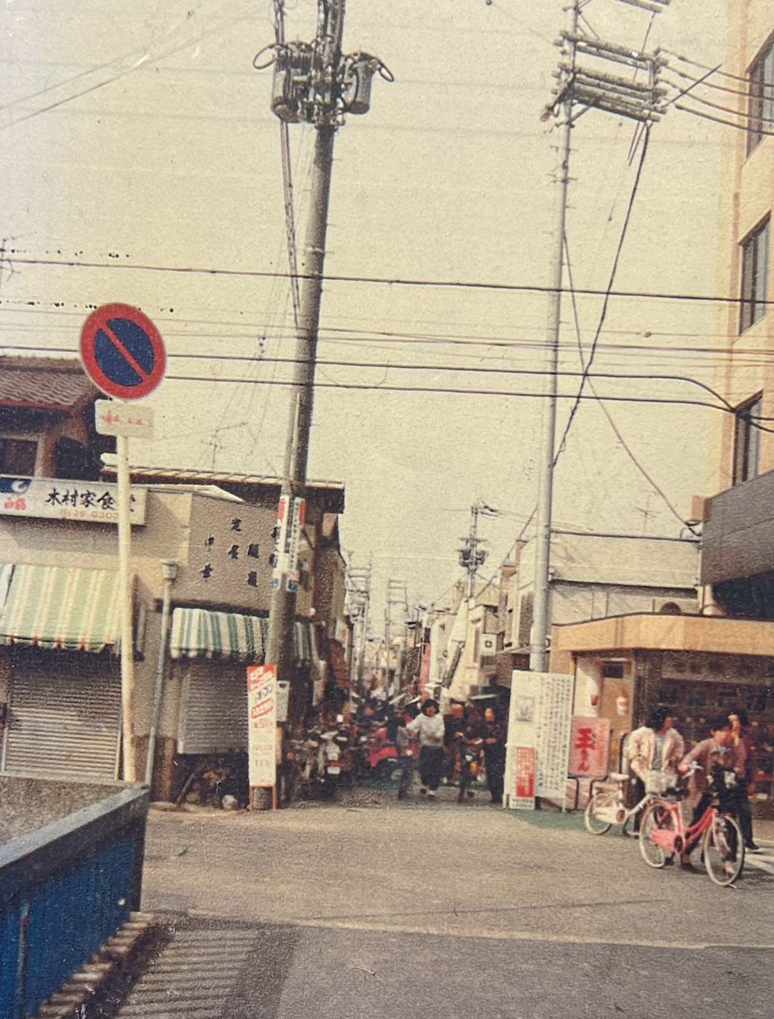 現在、ファミリーマートになっている場所は、木村家食堂でした。定食やうどん、中華などを提供する町の食堂でした。商店街の道幅は変わっていないので、当時かなりの人で賑わっていたことがわかります。