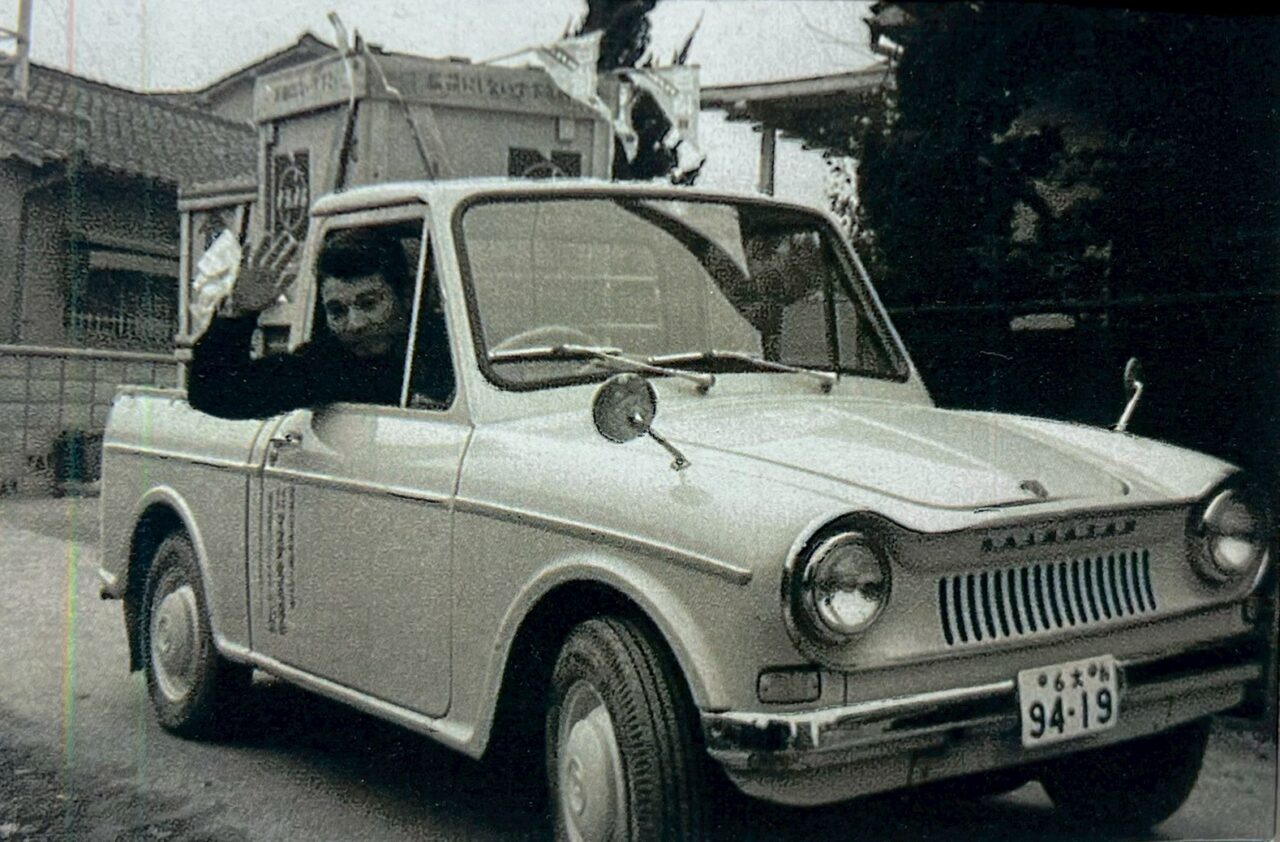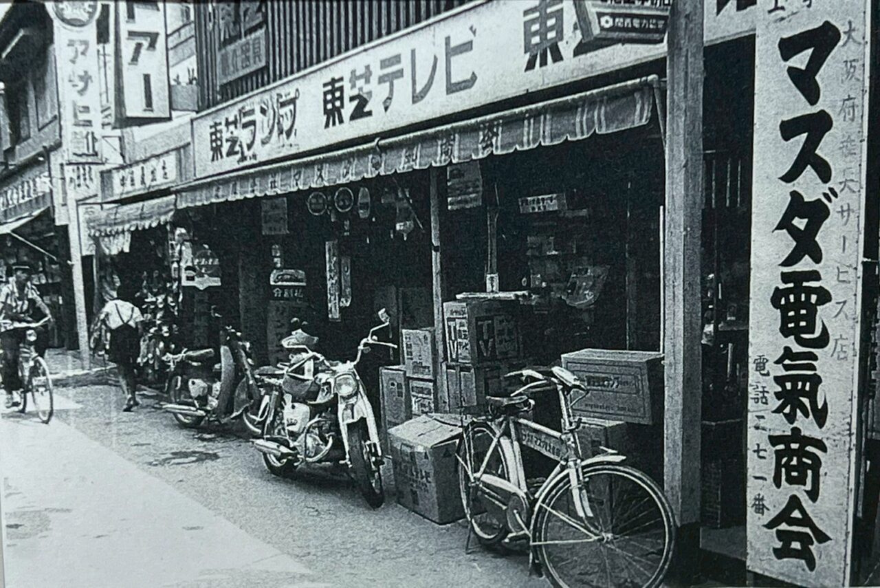 先代の社長が若かりし頃、配達に向かうところです。筆者の幼馴染のお父さんで、寝屋川の町中を納品や電気工事、修理で走り回っておられたのを思い出します。