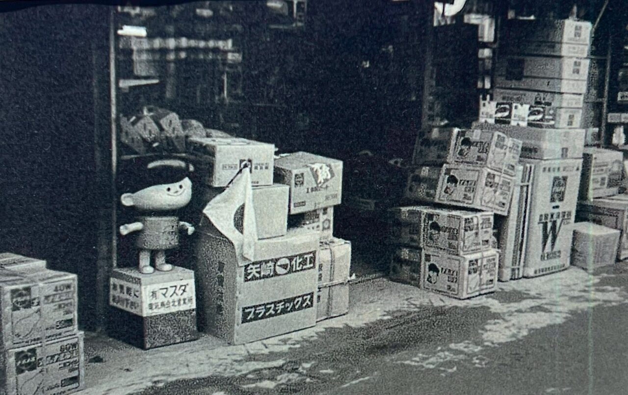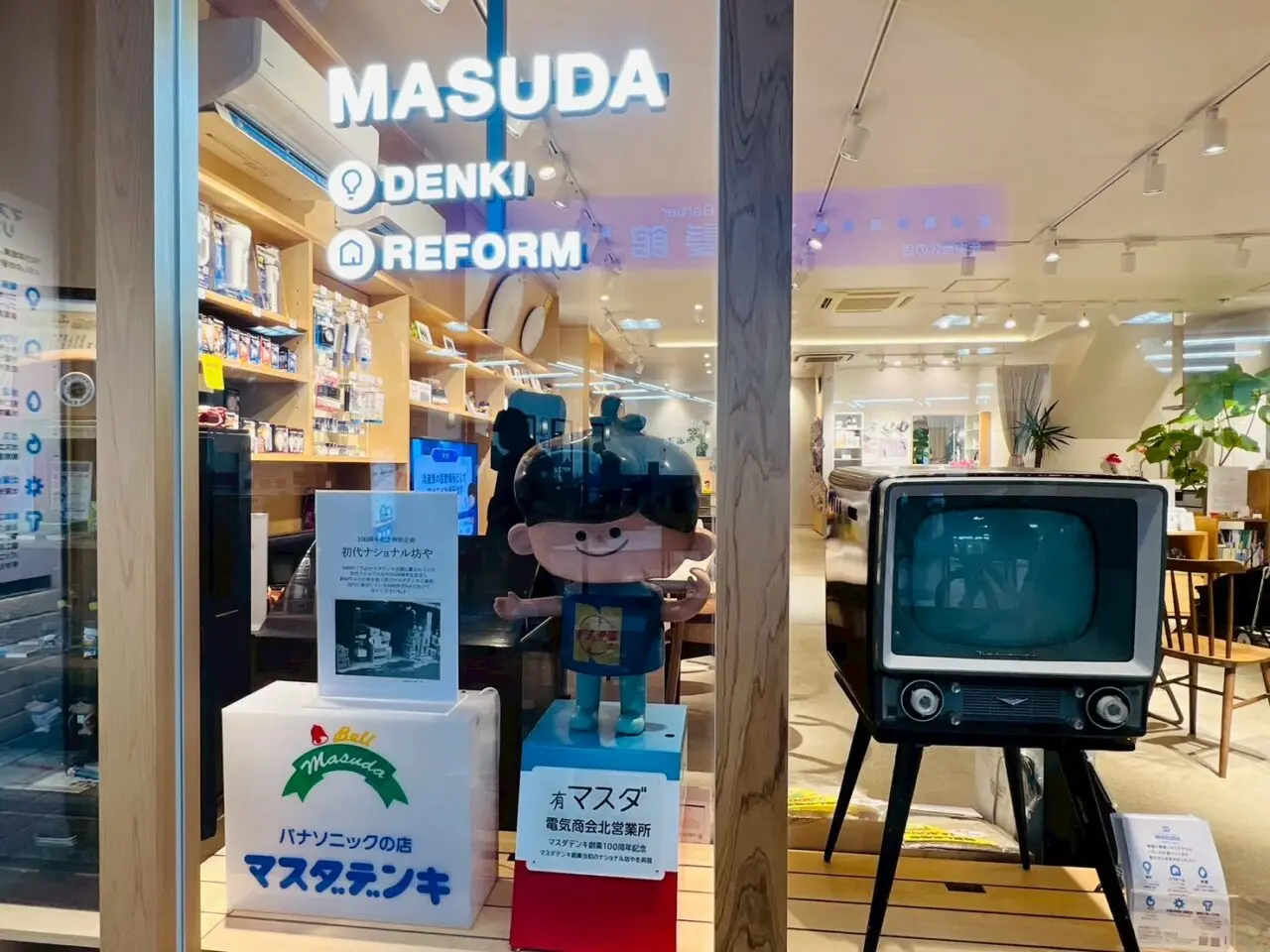 店頭には、懐かしいブラウン管のテレビや初代のナショナル坊やが飾られています。昭和のマスダデンキの店頭に置いてあった坊やと同タイプのものです。