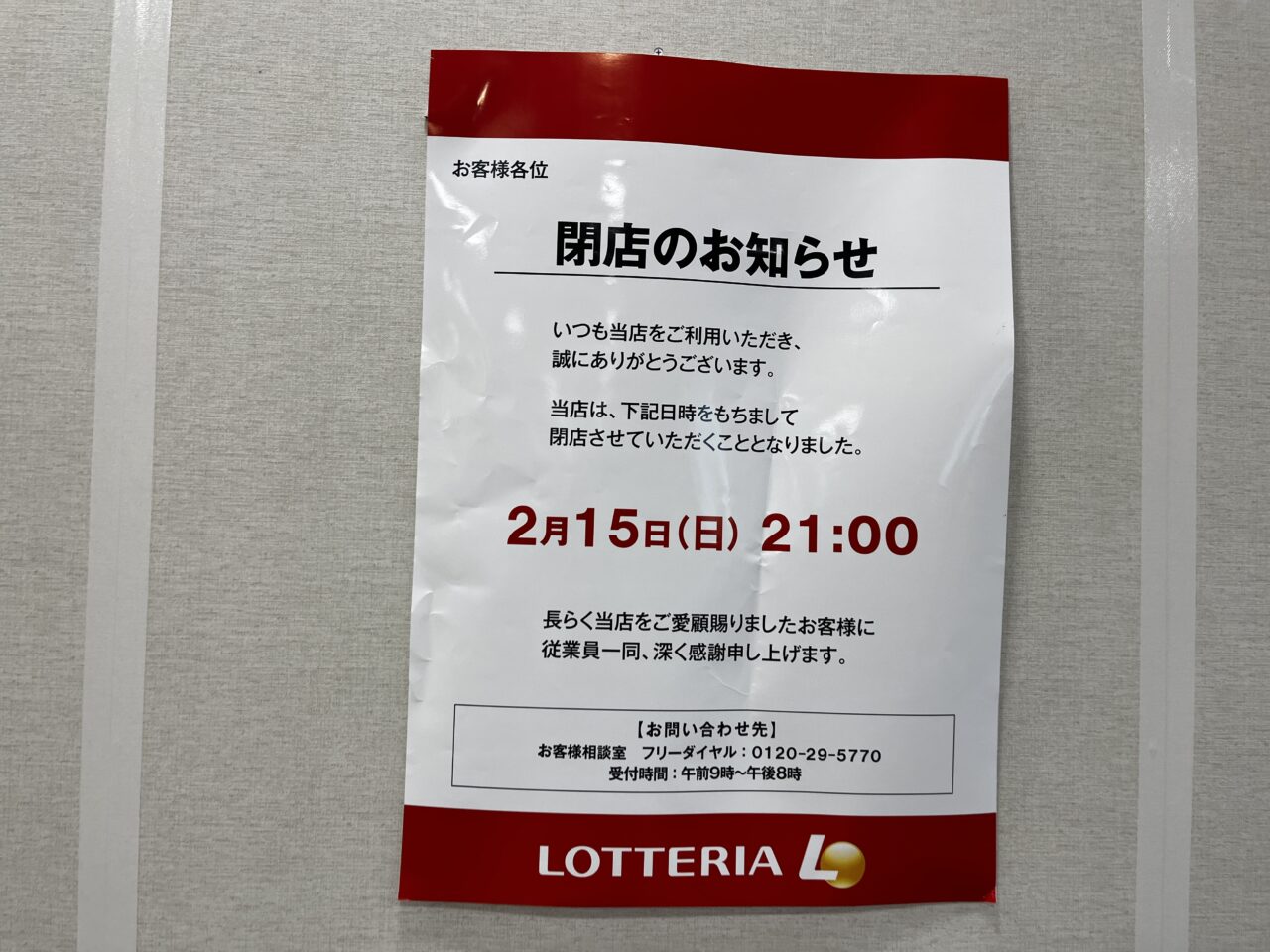高槻市萩之庄にあるイオン高槻店内1Fにある「ロッテリア イオン高槻店」が、2026年2月15日(日)21:00をもちまして閉店しました。