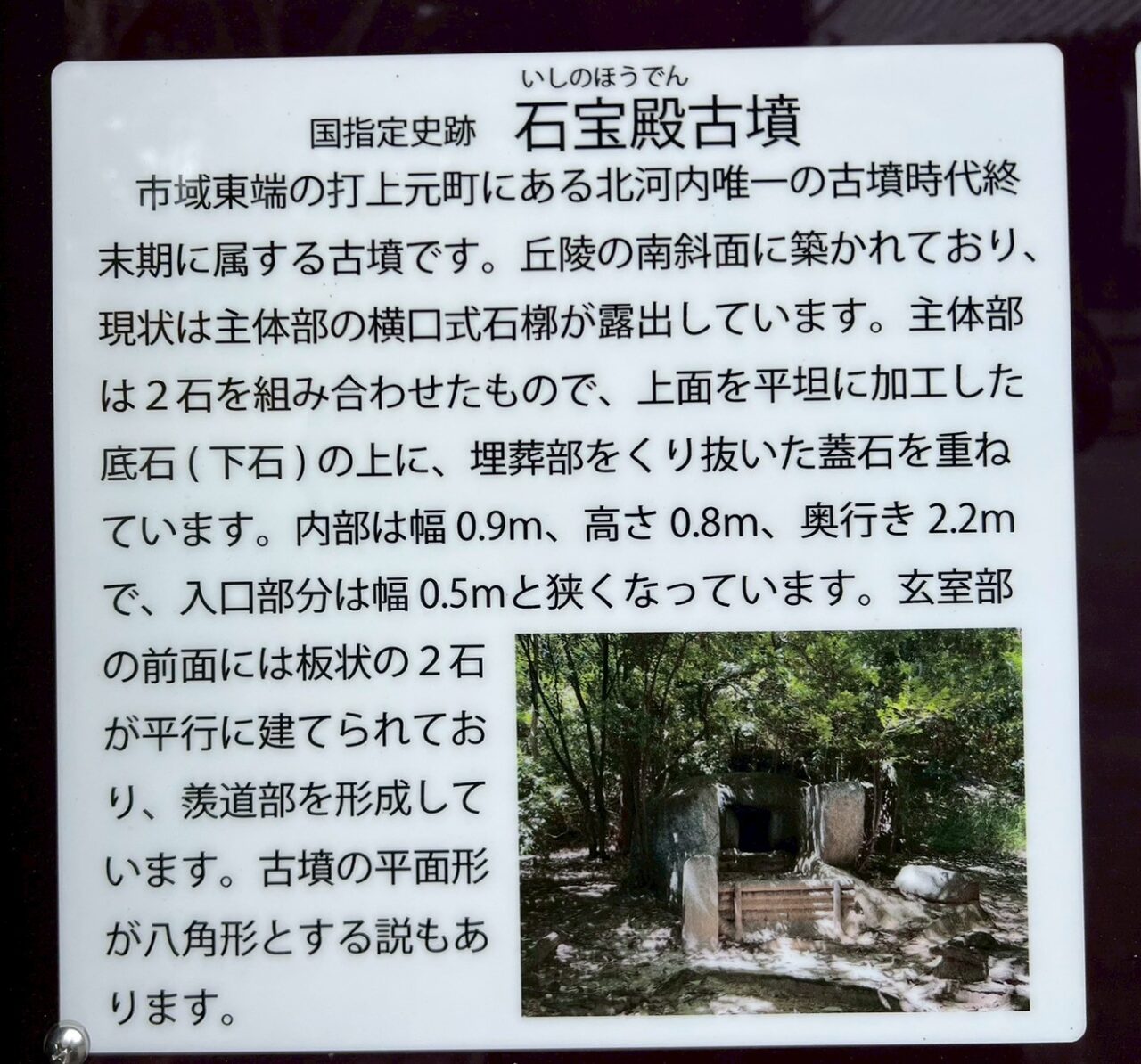 高宮廃寺と同じく国指定史跡の石の宝殿。この古墳は北河内唯一の古墳時代終末期のものとされています。