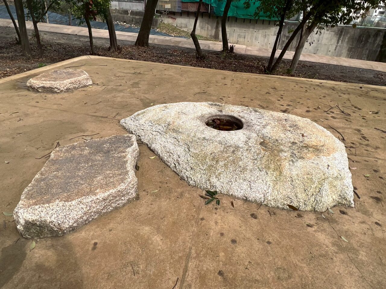 上部には、塔の心柱を支える心礎とその周りの四天柱の礎石1基、側柱の礎石2基が残っています。